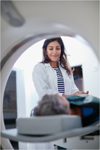Smiling radiologic technologist preparing a patient for an MRI scan.